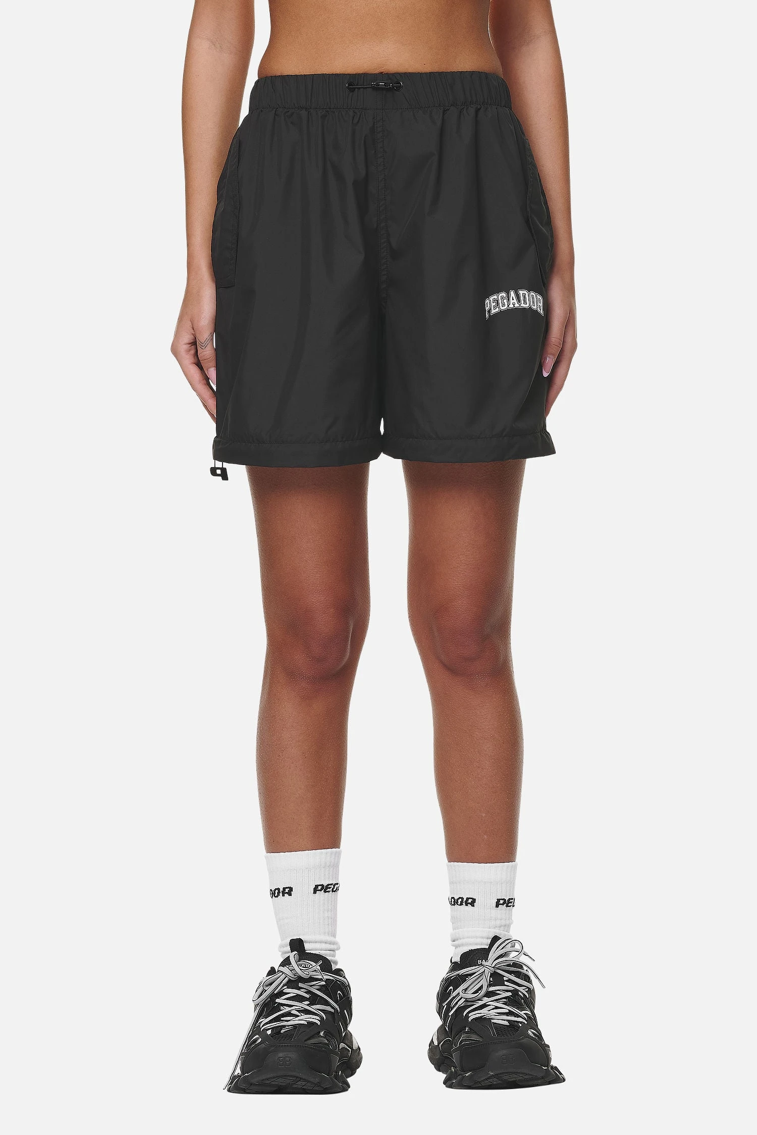 - white logo print to the left leg